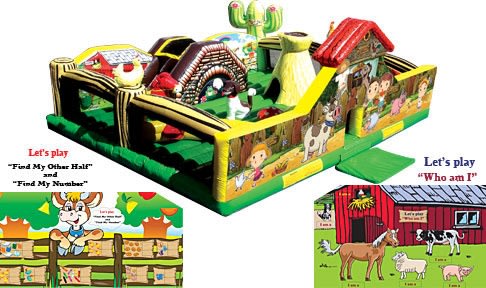 The Animal Farm™ educational inflatable structure is designed to educate and entertain toddlers in an adorable farm setting. This game offers a small climb and slide and several 3D animals and structures, such as a dog, horse, chickens, hay stock and a cactus. A ball pond is included in this bouncy castle, where kids can learn colors with plastic balls and coordinating baskets for collecting. The Animal Farm™ makes education fun with several vinyl patch games along the bouncy house's walls. Kids can try to Find My Number counting game, matching objects to their correct number. Find My Other Half enhances matching skills by matching pieces in yummy fruit shapes, and Who Am I gives a toddler lesson in zoology by matching animal shapes with their names.